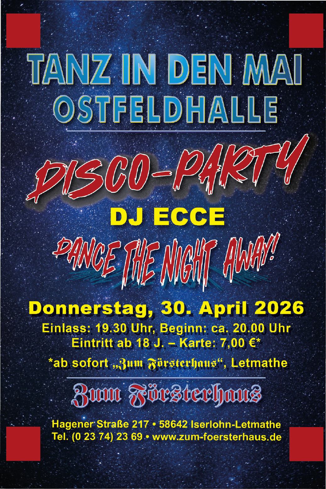 Auch in diesem Jahr vertreiben wir mit einer DISCO-PARTY den Winter und begrüßen den Mai bzw. den Frühling und den Sommer mit heißer Musik aller Stilrichtungen. Gute Laune ergibt sich von selbst. Also Herzlich Willkommen zum TANZ IN DEN MAI in der Ostfeldhalle!